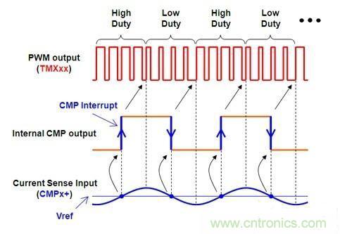 對(duì)于開關(guān)電源,PWM占空比決定輸出電壓,如圖3,電路開始工作后,LED電流經(jīng)采樣后加到MCU內(nèi)置比較器端口,和參考值進(jìn)行比較,產(chǎn)生中斷信號(hào),來調(diào)整PWM的占空比,其變化過程見圖4,如當(dāng)電流大于參考值時(shí),降低占空比;反之,提高占空比,最終達(dá)到一個(gè)負(fù)載電流動(dòng)態(tài)穩(wěn)定的狀態(tài)。