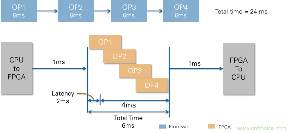 CPU按順序執(zhí)行操作,因此第一個(gè)操作必須在整個(gè)圖像上運(yùn)行結(jié)束后,第二個(gè)操作才能啟動(dòng)。在本例中,假設(shè)算法中的每個(gè)步驟在CPU上運(yùn)行需要6ms;因此,總處理時(shí)間是24毫秒?,F(xiàn)在考慮在FPGA上運(yùn)行相同的算法。由于FPGA本質(zhì)上是大規(guī)模并行的,所以該算法中的四個(gè)操作可以同時(shí)對圖像中的不同像素上操作。這意味著接收第一個(gè)處理的像素僅需2ms的時(shí)間,處理整個(gè)圖像需要4ms的時(shí)間,因而總處理時(shí)間為6ms。這比CPU的執(zhí)行速度快得多。即使使用FPGA協(xié)處理架構(gòu)并將圖像傳輸?shù)紺PU,整個(gè)處理時(shí)間(包括傳輸時(shí)間)也比單獨(dú)使用CPU要短得多。