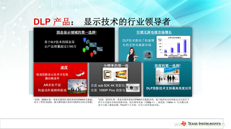 “在顯示應(yīng)用領(lǐng)域,DLP技術(shù)涵蓋范圍非常廣,從小巧的口袋型顯示器到高端大型的數(shù)字影院,TI一直保持大量的產(chǎn)品和技術(shù)創(chuàng)新。”Ane Sacks女士在會(huì)議中介紹到,“如今,TI已經(jīng)能夠?qū)崿F(xiàn)最高幀速率和最高亮度的快速投影顯示技術(shù),面向快速動(dòng)作視頻和游戲市場(chǎng);在面板分辨率上推出了入門級(jí)的4K平臺(tái),與此同時(shí)在1080P上也有十足的創(chuàng)新,推出了超高性價(jià)比的1080p Pico解決方案,未來市場(chǎng)潛力巨大。”