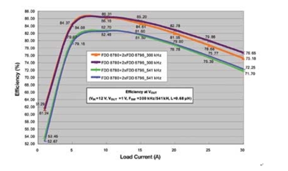 注意上面的兩條曲線,在滿載(30A)時,可以看到最新的器件的效率有1.5%的改進。同樣還是這兩條曲線,在負荷較小(15A)時,可以實現0.69%的改善。如果對整個負荷范圍積分,那么與今天常見的方案相比,使用最新的MOSFET器件時平均功率損耗可以降低8%~10%。即使在較高的開關頻率541kHz處,可以看到在負荷小時系統(tǒng)級效率仍然高于80%,而在滿載時效率大于70%。如果頻率繼續(xù)增加,那么開關損耗將急劇增加。