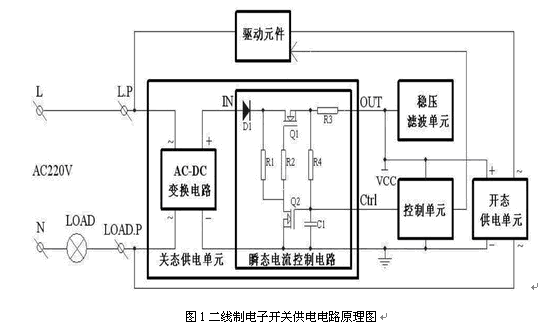 基于以上問(wèn)題,本文提供了一種用于二線(xiàn)制電子開(kāi)關(guān)的供電電路,在開(kāi)關(guān)關(guān)閉時(shí)給控制電路提供很小的電流,用以維持待機(jī)工作,開(kāi)關(guān)開(kāi)啟的瞬間,先由控制單元控制關(guān)態(tài)供電單元,提供較大的工作電流給控制單元和驅(qū)動(dòng)元件,使開(kāi)關(guān)開(kāi)啟,然后轉(zhuǎn)入開(kāi)態(tài)供電狀態(tài)。當(dāng)開(kāi)關(guān)關(guān)閉時(shí),控制單元控制關(guān)態(tài)供電單元提前進(jìn)入大電流工作狀態(tài),迅速補(bǔ)充開(kāi)關(guān)關(guān)閉瞬間控制單元和驅(qū)動(dòng)元件消耗的功率,使電源濾波電容兩端的電壓維持在額定值。有效地解決了負(fù)載燈具閃爍的問(wèn)題。