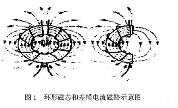 在環(huán)形共模電感的特殊場合中,每條引線中的差模電流密度可假定是相等的,且方向相反。由此而產生的磁場必定在環(huán)形磁芯周邊上的總和為零,而在其外部的總和則不為零。