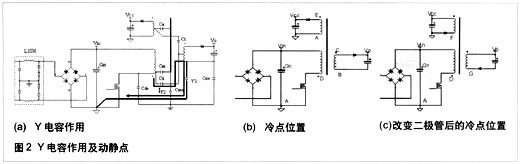 共模電流在輸入及輸出線與大地間流動,主要有下面幾部分:通過MOSFET源級到大地的電容Cde。如果改進(jìn)IC的設(shè)計(jì),如對于單芯片電源芯片,將MOSFET源極連接到芯片基極,用于散熱,而不是用漏極進(jìn)行散熱,這樣可以減小漏極對大地的寄生電容。PCB布線時(shí)減小漏極區(qū)銅皮的面積可減小漏極對大地的寄生電容,但要注意保證芯片的溫度滿足設(shè)計(jì)的要求;通過Cm 和Cme產(chǎn)生共模電流;通過Ca和 Cme產(chǎn)生共模電流;通過Ct和Coe產(chǎn)生共模電流;通過Cs和Coe產(chǎn)生共模電流,這部分在共模電流中占主導(dǎo)作用。減小漏極電壓的變化幅值及變化率可減小共模電流,如降低反射電壓,加大漏-源極電容,但這樣會使MOSFET承受大的電流應(yīng)力,其溫度將增加,同時(shí)加大漏-源極電容,產(chǎn)生更強(qiáng)的磁場。如果系統(tǒng)加了Y電容,如圖2所示,通過Cs的大部分共模電流被Y 電容旁路,返回到初級的地,因?yàn)閅電容的值大于Coe。Y電容必須直接并用盡量短的直線連接到初級和次級的冷點(diǎn)。如果導(dǎo)通時(shí)MOSFET的dV/dt大于關(guān)斷時(shí)的值,Y電容則連接到初級的地,反之連接到Vin。