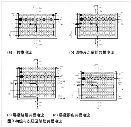 如果在內(nèi)層及初級、次級繞組間放置銅皮,銅皮的寬度小于或等于初級繞組的寬度,銅皮的中點(diǎn)由導(dǎo)線連到冷點(diǎn),如圖3(c)所示,由于銅皮為冷點(diǎn),與其接觸的繞組和銅皮間電壓的擺率降低,從而減小共模電流,同時(shí)將共模電流由銅皮旁路引入到冷點(diǎn)。注意銅皮的搭接處不能短路,用絕緣膠帶隔開,內(nèi)外層銅皮的方向要一致。輔助繞組和次級繞組的共模電流可以由以下方法補(bǔ)償:① 加輔助屏蔽繞組:輔助屏蔽繞組繞制方向與次級繞組保持一致,輔助屏蔽繞組與次級繞組的同名端連接到一起,并連接到冷點(diǎn),輔助屏蔽繞組的另一端浮空。由于它們的電壓變化的方向相同,所以兩者間沒有電流流動。②加外層的輔助屏蔽銅皮:輔助屏蔽銅皮的中點(diǎn)連接到輔助繞組的中點(diǎn)。同樣,基于電壓的變化方向分析電流的方向,可以看到,兩者之間的電流形成環(huán)流,相互補(bǔ)償?shù)窒瑥亩档凸材k娏鳌?br />