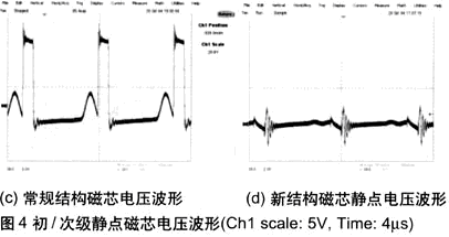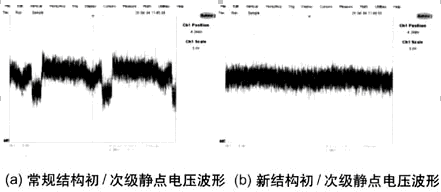 測量變壓器初級和次級靜點(diǎn)的電壓波形及變壓器磁芯的電壓波形,可以為EMI的傳導(dǎo)測試提供一些參考(見圖4)。常規(guī)結(jié)構(gòu)變壓器的初級和次級靜點(diǎn)電壓波形的幅值為10V,并且可以明顯地看到基于開關(guān)頻率的開關(guān)波形。新結(jié)構(gòu)變壓器的初級和次級靜點(diǎn)電壓波形的幅值為5V,基于開關(guān)頻率的開關(guān)波形不是很明顯。常規(guī)結(jié)構(gòu)的變壓器的磁芯電壓波形的幅值為18V,可以明顯地看到基于開關(guān)頻率的開關(guān)波形。新結(jié)構(gòu)的變壓器的磁芯電壓波形的幅值為5V,基于開關(guān)頻率的開關(guān)波形不是很明顯。