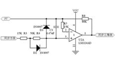 在如圖3所示的同步方波發生電路中,將工頻電壓同步取樣信號通過電阻 R7 加在運算放大器I3的反相輸入端,與同相輸入端的+3V參考電壓進行過零比較,那么運算放大器的輸出端將得到脈沖寬度符合設計要求的方波電壓。