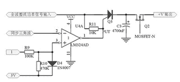 當調整管(放大管)漏極(集電極)電壓與源極(發射極)電壓之差的平均值小于3V 時,差壓比較兼積分濾波電路的輸出電壓會增大,延時比較開關電路正向脈沖的啟動時間會提前。反之,正向脈沖的啟動時間就會向后延遲。從而使延時比較開關輸出電壓的正向脈沖寬度起動時間受差壓比較兼積分濾波器輸出的電壓控制,再加到可控硅的控制端K,對4700mF的大電容C3進行受控延時導通。C3電容上的電壓由于充電啟動時間和充電電壓所處位置的不同而得到不同的充電電壓。