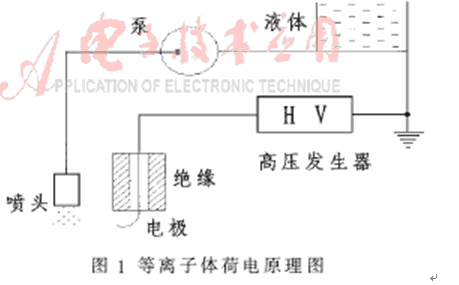圖1所示為等離子體荷電原理圖,當在電極上施加一定的脈沖高壓時,窄脈沖電暈放電中產(chǎn)生的高能電子能使氣體電離成正、負離子,同時在空間電場中,由于高壓脈沖上升沿陡峭,電子可瞬間加速,而離子幾乎不加速。在這種放電等離子體中,電子溫度特別高,可形成大量的激發(fā)態(tài)分子,各種極富反應的自由基將會引發(fā)氣體分子電離。在電極附近,極性與電極極性相異的離子被電極吸附,與電極極性相同的離子受電排斥并在周圍形成離子區(qū)[1]。當藥液在泵或其他外力的作用下由噴頭霧化后形成霧滴并通過電離區(qū)與離子碰撞時,就把電荷傳給霧滴,使霧滴荷電。而霧滴又對離子產(chǎn)生排斥力,使充電速度下降,直至充電停止而達到飽和。