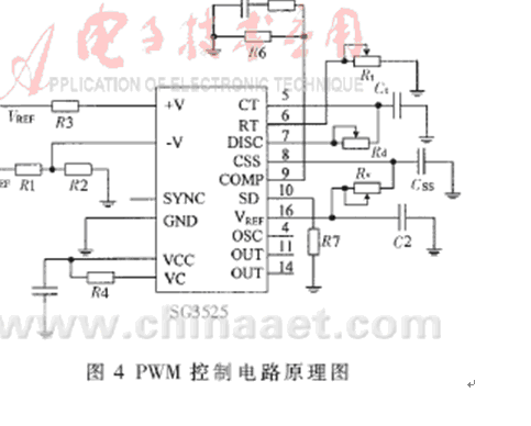 在以IGBT設(shè)計的逆變電源中,PWM控制電路是極其重要的組成部分,SG3525脈寬調(diào)制型控制器作為SG3524的改進型,更適合于開關(guān)器件的雙端DC-DC變換器,它的外圍電路原理圖如圖4所示,輸出波形如圖5所示。