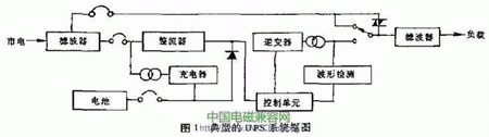 UPS不問(wèn)斷電源是個(gè)特殊的設(shè)備,它既是電網(wǎng)的負(fù)載,又要給負(fù)載提供電源。所以它的EMC設(shè)計(jì)既要保證它不對(duì)電網(wǎng)造成電磁污染,又要保證它提供給負(fù)載的是個(gè)干凈的電源。UPS本身振蕩電路就是一個(gè)干擾源。典型的UPS系統(tǒng)框圖如圖l所示。它的基本結(jié)構(gòu)是一套將交流市電變?yōu)橹绷麟姷恼髌鳌⒊潆娖骱桶阎绷麟娫僮優(yōu)榻涣麟姷哪孀兤鳎姵卦诮涣髡9╇妼?duì)儲(chǔ)存能量且維持在一個(gè)正常的充電電壓上.一旦市電中斷,蓄電池立即對(duì)逆變器供電 保證UPS交流輸出。