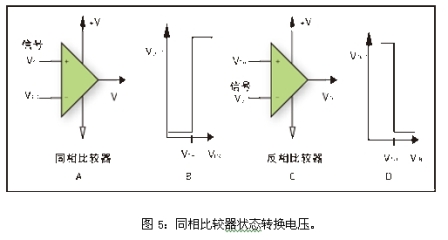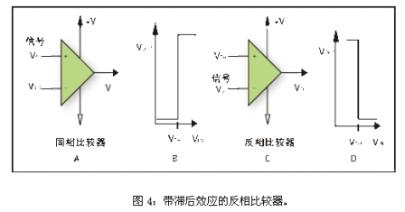 圖1B和1D給出了比較器電路的轉(zhuǎn)換函數(shù)。同相比較器被定義為在輸入信號大于門限電壓時輸出為正的比較器,而反相比較器被定義為輸入信號大于門限電壓時輸出為負的比較器。