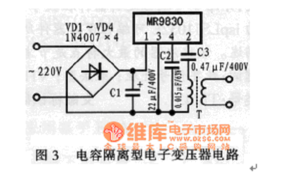 由于該電子變壓器輸出的是高頻電壓,所以,電路中T的次級(jí)輸出只要由一只高頻二極管半波整流、濾波后,再由一只三端穩(wěn)壓器穩(wěn)壓便可得到所需的直流電壓。