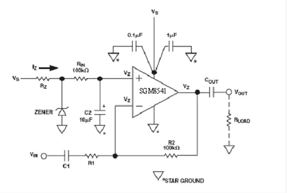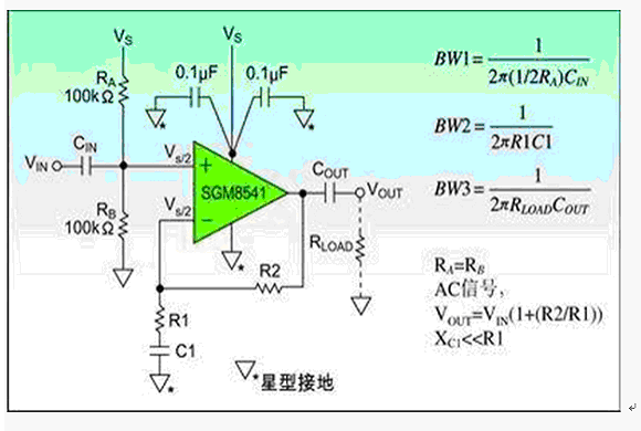 首先,電路的電源抑制幾乎沒(méi)有,電源電壓的任何變化都將直接通過(guò)兩個(gè)分壓電阻改變偏置電壓Vs/2,但電源抑制的能力是電路非常重要的特性。例如此電路的電源電壓1伏的變化,能引起偏置電路電壓的輸出Vs/2變化0.5伏。該電路的電源抑制僅僅只有6dB,通過(guò)選用SGM8541運(yùn)算放大器可以增強(qiáng)電源抑制能力。
