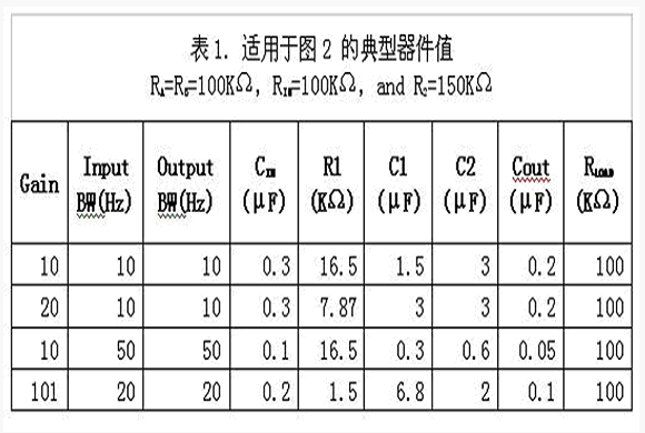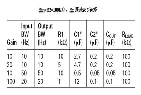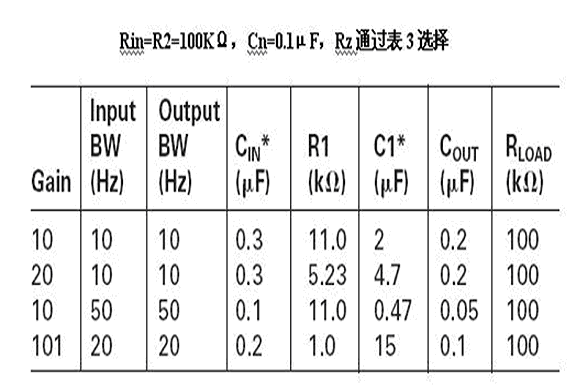 設(shè)計(jì)單電源運(yùn)算放大器電路,需要考慮輸入偏置電流誤差、電源抑制、增益、以及輸入與輸出線路帶寬等等。然而普通的應(yīng)用設(shè)計(jì)是可以通過(guò)查表來(lái)獲得,見(jiàn)表1。在單電源電壓為15V或12V時(shí)偏置分壓的兩個(gè)電阻通常選用100kΩ,這樣可以在電源消耗與輸入偏置電流誤差之間合理的折中。5V單電源偏置分壓電阻減小到一個(gè)比較低的值,例如42kΩ。還有些在3.3V應(yīng)用中偏置分壓電阻選在27kΩ左右。