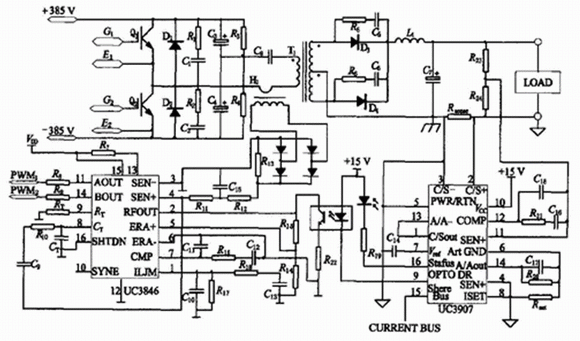 因為電源并聯(lián)在一起, 很難達(dá)到輸出電流分配均勻, 所以并聯(lián)電源模塊間必須采用均流措施。某DC/DC變換器要求: 輸入電壓為385V, 輸出電壓38V, 輸出電流為100A, 必要時多臺開關(guān)穩(wěn)壓電源可以直接并聯(lián)使用, 并聯(lián)使用時的負(fù)載不均衡度小于5%。DC/DC變換器主電路采用半橋式電路拓?fù)?控制芯片采用TI公司生產(chǎn)的電流控制型PWM集成控制芯片UC3846, 在比較幾種均流控制方案的基礎(chǔ)上, 選擇了根據(jù)最大電流自動均流法而設(shè)計的UC3907 均流控制芯片, 實現(xiàn)了并聯(lián)運行時均流控制。電源模塊在并聯(lián)時, 取得較好的均流效果。