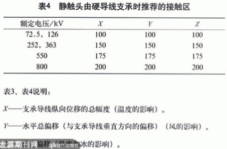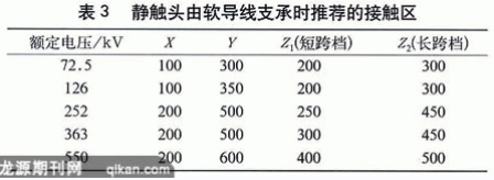 單柱垂直斷口隔離開(kāi)關(guān),因其靜觸頭懸掛在母線上,為了適應(yīng)風(fēng)力、溫度和冰雪的影響,確保隔離開(kāi)關(guān)能可靠合閘,GB1985對(duì)接觸區(qū)(也稱鉗夾范圍)提出了推薦值,如表3、表4。在進(jìn)行變電站設(shè)計(jì)和選用隔離開(kāi)關(guān)時(shí),應(yīng)考慮到具體運(yùn)行條件,確保靜觸頭處在規(guī)定的接觸區(qū)限值之內(nèi),使隔離開(kāi)關(guān)能正確地分合閘。