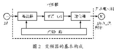 圖2所示為變頻器的基本構成。它的基本原理是用一種特定的方式對變頻器中的晶閘管開關進行導通和關斷,直接把輸入的電壓波形“大致”調制成所需頻率的交流波形。