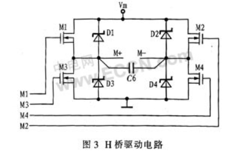 相對(duì)來說,利用2個(gè)N溝道功率MOSFET和2個(gè)P溝道功率MOSFET驅(qū)動(dòng)電機(jī)的方案,控制電路簡(jiǎn)單、成本低。但由于加工工藝的原因,P溝道功率MOSFET的性能要比N溝道功率MOSFET的差,且驅(qū)動(dòng)電流小,多用于功率較小的驅(qū)動(dòng)電路中。而N溝道功率MOSFET,一方面載流子的遷移率較高、頻率響應(yīng)較好、跨導(dǎo)較大;另一方面能增大導(dǎo)通電流、減小導(dǎo)通電阻、降低成本,減小面積。綜合考慮系統(tǒng)功率、可靠性要求,以及N溝道功率MOSFET的優(yōu)點(diǎn),本設(shè)計(jì)采用4個(gè)相同的N溝道功率MOSFET的H橋電路,具備較好的性能和較高的可靠性,并具有較大的驅(qū)動(dòng)電流。其電路圖如圖3所示。圖中Vm為電機(jī)電源電壓,4個(gè)二極管為續(xù)流二極管,輸出端并聯(lián)一只小電容C6,用于降低感性元件電機(jī)產(chǎn)生的尖峰電壓。