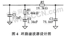 三階環(huán)路濾波電路如圖4所示,PFD的相位檢測(cè)頻率fr=200 kHz,相位裕量φp=45°,由于外接晶體振蕩頻率源為20 MHz,所以計(jì)算出參考分頻比N=100,利用ADI公司提供的ADIsimPLL工具計(jì)算三階環(huán)路濾波器參數(shù):R1=9.46 kΩ,C1=173 pF,C2=2.36 nF,R2=19.3 kΩ,C3=79 pF。