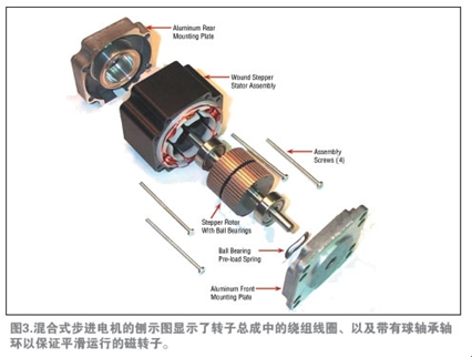 混合式步進(jìn)電機(jī)結(jié)合了永磁和開關(guān)磁阻電機(jī)的工作原理,在轉(zhuǎn)子軸上裝有一對或多對外圓周有很多齒的定子疊片,在每對定子疊片間有一個永磁體,會在軸向上生成北極和南極。齒的數(shù)量、電機(jī)結(jié)構(gòu)與驅(qū)動方案等幾項(xiàng)因素確定了電機(jī)的步進(jìn)角度,多數(shù)應(yīng)用指定了混合式步進(jìn)電機(jī)1.8°的步長(每轉(zhuǎn)200步長)(見參考資料)。