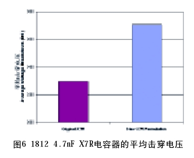 如前面敘述的那樣,有許多材料可以滿(mǎn)足X7R或C0G(NP0)的這類(lèi)TCC要求。這些材料與各種設(shè)計(jì)的組合并不能在施加的DC電壓下以完全相同的方式實(shí)現(xiàn)。不同制造商任何給定電壓的可用容量一定會(huì)有很大的差異。較高的電壓可以與X 7 R 電解質(zhì)中的鐵電疇(ferroelectric domain)相耦合,在元件上產(chǎn)生一種機(jī)械應(yīng)力。這種“壓電應(yīng)力”會(huì)導(dǎo)致電容器在z方向上若干微米的移動(dòng)。當(dāng)然,這是根據(jù)壓電執(zhí)行器的原理,但是在MLCC的情況下,連續(xù)的電壓尖峰會(huì)導(dǎo)致應(yīng)力裂紋和故障。為了解決這個(gè)問(wèn)題,應(yīng)該使用這種具有降低壓電耦合能力的2000VDC 以上額定值的X7R電解質(zhì)電容器。降低耦合系數(shù)的影響可以增加擊穿耐壓,如圖6所示。這些設(shè)計(jì)采用了完全相同的有效厚度和“浮動(dòng)電極”型設(shè)計(jì)。唯一的差異在于X7R電解質(zhì)的新制劑方面的修改,它可以減少與施加電壓的耦合。這種新制劑已用于我們的高壓OMD-Cap產(chǎn)品線(xiàn)。