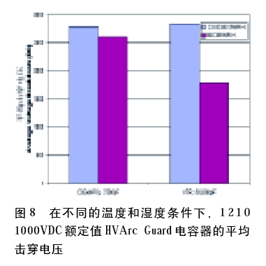 如前面提到的那樣,電容器或電路板涂層可以防止表面弧,而且還可以作為一種防潮的屏障。為了測(cè)試HVArc Guard元件對(duì)由濕度引起的故障的易感性,對(duì)1210外殼尺寸、1000VDC額定值的MLCC樣品進(jìn)行了擊穿電壓測(cè)試,其環(huán)境條件為23.8℃/53.3%RH,提高的溫濕度為85℃/85%RH。其結(jié)果如圖8所示。盡管在85/85條件下X7R的平均擊穿電壓相當(dāng)?shù)停獵0G(NP0)幾乎不受影響。因此,C0G(NP0)看似不那么易受潮濕所引起故障的影響,而兩種情況的擊穿都是在容許范圍以?xún)?nèi),即使是在高濕度條件下。兩種環(huán)境條件下測(cè)試的元件擊穿范圍均高于額定電壓。