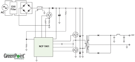 NCP1901半橋諧振段工作在固定的頻率和占空比,從而降低開關損耗。這器件通過調制半橋電源段實現穩壓,而其在初級端的穩壓消除了反饋環路,簡化了電路。安森美半導體并基于NCP1901推出新的90 W筆記本適配器參考設計,如圖3所示。這參考設計在115 Vac和230 Vac輸入條件下測得的工作能效分別為89.4%和90.9%,115 Vac條件下的空載能耗為420 mW,且符合IEC61000-3-2要求的EPA 2.0規范對功率因數的要求(即115 Vac條件下功率因數不低于0.9),以及EPA 2.0對工作能效的要求。