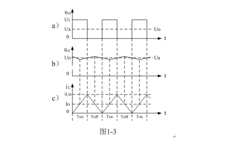 圖1-3、圖1-4、圖1-5分別是控制開關K的占空比D等于0.5、< 0.5、> 0.5時,圖1-2電路中幾個關鍵點的電壓和電流波形。圖1-3-a)、圖1-4-a)、圖1-5-a)分別為控制開關K輸出電壓uo的波形;圖1-3-b)、圖1-4-b)、圖1-5-b)分別為儲能濾波電容兩端電壓uc的波形;圖1-3-c)、圖1-4-c)、圖1-5-c)分別為流過儲能電感L電流iL的波形。