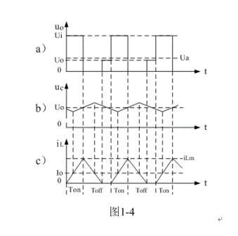 (2)當Ui > 2Uo時,即:濾波輸出電壓Uo小于電源輸入電壓Ui的一半時,或控制開關K的占空比小于二分之一時:雖然在K接通期間,流過儲能電感L的電流上升率(絕對值),大于,在K關斷期間,流過儲能電感L的電流上升率(絕對值);但由于(1-5)式中i(0)等于0,以及Ton小于Toff,此時,(1-11)式中的iLX會出現負值,即輸出電壓反過來要對電感充電,但由于整流二極管D的存在,這是不可能的,這表示流過儲能電感L的電流提前過0,即有斷流。在這種情況下,流過儲能電感L的電流iL不是連續電流,開關電源工作于電流不連續狀態,因此,輸出電壓Uo的紋波比較大,且濾波輸出電壓Uo小于濾波輸入電壓uo的平均值Ua。參看圖1-4。