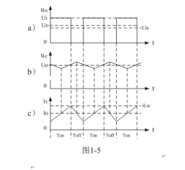 (3)當Ui < 2Uo時,即:濾波輸出電壓Uo大于電源輸入電壓Ui的一半時,或控制開關K的占空比大于二分之一時:在K接通期間,雖然流過儲能電感L的電流上升率(絕對值),小于,在K關斷期間,流過儲能電感L的電流上升率(絕對值)。但由于Ton大于Toff,(1-5)式中i(0)和(1-11)式中iLX均大于0,即:電感存儲能量每次均釋放不完。在這種情況下,流過儲能電感L的電流iL是連續電流,開關電源工作于連續電流狀態,輸出電壓Uo的紋波比較小,且濾波輸出電壓Uo大于濾波輸入電壓uo的平均值Ua。參看圖1-5。