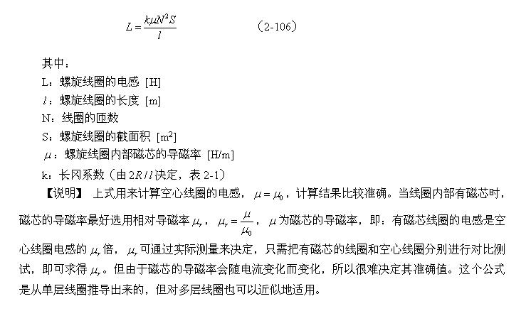在這種情況下,最好的方法是先制作一個(gè)簡單樣品,例如,在某個(gè)選好的變壓器鐵芯的骨架上繞一個(gè)簡單線圈(比如匝數(shù)為10),然后對線圈的電感量進(jìn)行測試,或者找一個(gè)已知線圈匝數(shù)與電感量的樣品作為參考。知道了線圈樣品的電感量后,只需把已知參數(shù)代入(2-108)或(2-94)式,即可求出其它未知參數(shù),然后把所有已知參數(shù)定義為一個(gè)常數(shù)k;最后電感的計(jì)算公司就可以簡化為:L = kN2 ,這樣,電感量的計(jì)算就變得非常簡單。