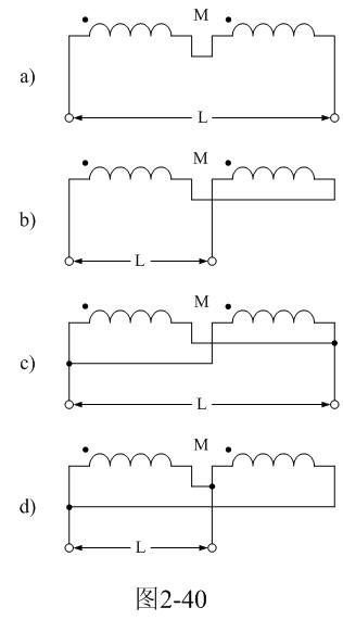 【說明】互感M有正負(fù),圖2-40-a和圖2-40-c的接法互感M為正,圖2-40-b和圖2-40-d的接法互感M為負(fù)。兩個(gè)線圈之間的互感M為: