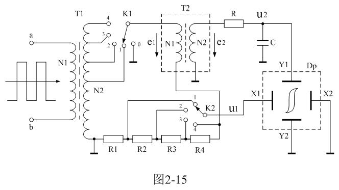 在圖2-15中,變壓器T1為信號(hào)源,通過K1選擇變壓器T1次級(jí)線圈的抽頭就可以改變信號(hào)源的電壓輸出;T2為待測(cè)變壓器樣品,Dp為示波器;R1、R2、R3、R4為顯示磁場(chǎng)強(qiáng)度H的取樣電阻,取樣電壓u1作為示波器X軸偏轉(zhuǎn)顯示輸入電壓,通過K2可以選擇取樣電壓輸出,從而可以改變示波器X軸偏轉(zhuǎn)顯示的寬度;電阻R和電容C為積分電路,積分電壓u2由電容C兩端輸出,作為示波器Y軸偏轉(zhuǎn)顯示輸入電壓,以顯示磁通密度B。