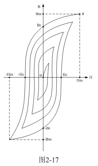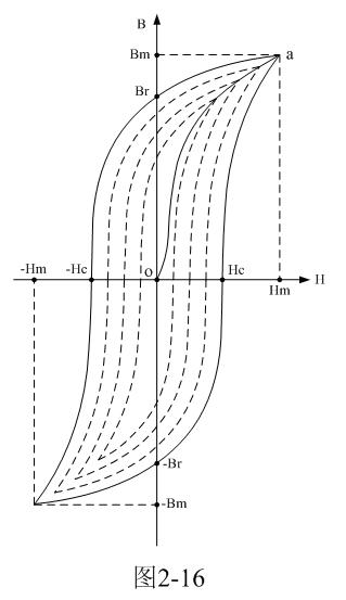 磁矯頑力的大小反映鐵磁材料保持剩磁狀態(tài)的能力。圖2-16表明,當(dāng)磁場(chǎng)按Hm→0→-Hc→-Hm→0→Hc→Hm次序變化時(shí),B所經(jīng)歷的相應(yīng)變化為Bm→Br→0→-Bm→-Br→0→Bm。于是得到一條閉合的B~H曲線,稱為磁滯回線。所以,當(dāng)鐵磁材料處于交變磁場(chǎng)中時(shí)(如變壓器中的鐵芯),它將沿磁滯回線反復(fù)被磁化→去磁→反向磁化→反向去磁,這個(gè)過程周而復(fù)始。
