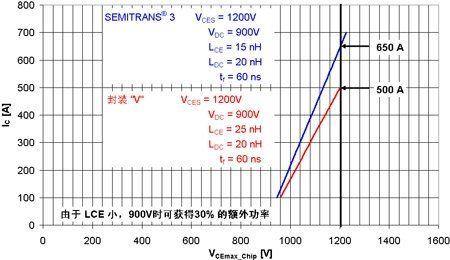 當使用低電感模塊時,可以實現高可靠性和最高效率。圖3顯示SEMITRANS®3和與其作對比的不同形狀封裝“C”之間的差異。由于模塊的電感小,SEMITRANS®3在芯片的最大反向電壓達到之前可切換的電流值要高30%。受益于主端子加上用于DCB的對稱并聯設計,SEMITRANS®模塊可實現低電感(請注意,依托模塊電感,半導體芯片上實際產生的電壓永遠高于端子上產生電壓)。