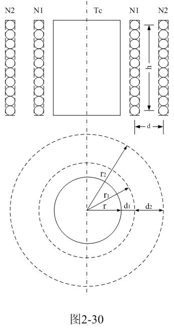 在圖2-30中,N1、N2分別為變壓器的初、次級線圈,Tc是變壓器鐵芯。r是變壓器鐵芯的半徑,r1、r2分別是變壓器初、次級線圈的半徑;d1為初級線圈到鐵芯的距離,d2為初、次級線圈之間的距離。為了分析計算簡單,這里假設變壓器初、次級線圈的匝數(shù)以及線徑相等,流過線圈的電流全部集中在線徑的中心;因此,它們之間的距離全部是兩線圈之間的中心距離,如虛線所示。