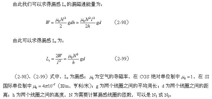 如果我們拿(2-99)式與(2-67)式或(2-94)式進行對比,可以看出,線圈漏感與線圈的電感是沒有本質區(qū)別的,只是磁路和磁通密度以及介質導磁率等參數(shù)需要根據(jù)實際情況來決定。