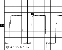 開關(guān)管S1和S的Uds波形如圖3所示,RefA為S管壓降波形,50V/div,RefB為S1管壓降波形,50V/div。電路此時工作在Vin=60V左右,S1和S的開關(guān)應(yīng)力大概為120V,D=0.5左右。圖4為變壓器輸出電壓,也就是同步整流管SR1和SR的驅(qū)動信號,正的部分為SR的驅(qū)動信號,負(fù)的部分為SR1的驅(qū)動信號。實(shí)驗(yàn)所得波形和分析的波形基本吻合,只是在開關(guān)轉(zhuǎn)換瞬間,電壓有小尖峰,這是由電路的雜散參數(shù)引起的。該電路的工作效率經(jīng)過測量大約在90%左右,基本達(dá)到設(shè)計(jì)的要求。