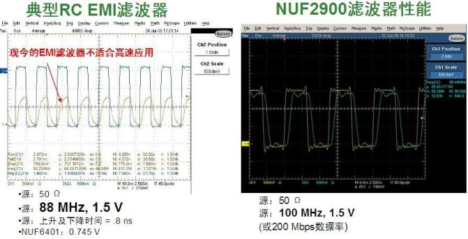 圖4:典型RCEMI濾波器與高速LCEMI濾波器(NUF2900)的響應(yīng)性能比較。