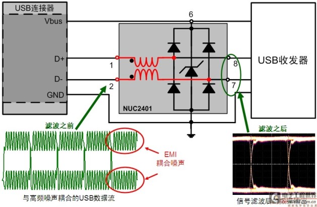 圖5:帶超低電容ESD保護(hù)的集成CMC濾波器NUF2401MN用于USB2.0等高速應(yīng)用。