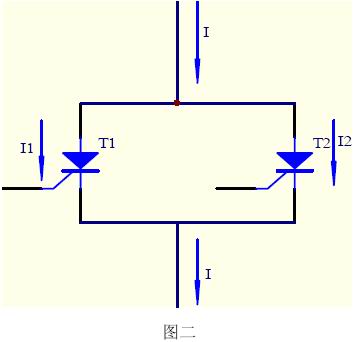 由于單個元件耐壓水平的提高,每個元件并聯工作以增大設備功率的情形更常見,以兩只晶閘管并聯工作為例,如圖二所示。