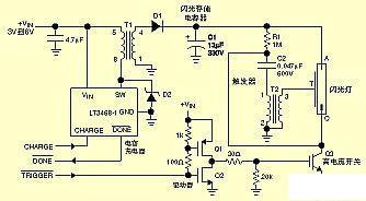 閃光電容器充電器基本上是一種具有某些特殊能力的變壓器耦合升壓轉(zhuǎn)換器。當(dāng)其“充電”控制線為高電位時(shí),穩(wěn)壓器同步內(nèi)部功率開關(guān),使升壓變壓器產(chǎn)生高電壓脈沖。然后,這些脈沖再經(jīng)整流和濾波,產(chǎn)生300V的直流輸出,其轉(zhuǎn)換效率高達(dá)80%。