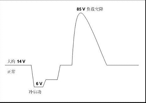 如12V電池電源線的電壓瞬變范圍(VIN)非常寬廣,小至6V,,大至87V。典型的車載電力系統的工作電壓范圍往往只有在9V~16V。引擎關閉時電池的正常額定電壓為12V,啟動時為14.4V。但是,這個范圍在瞬變狀態時很容易擴大到80V峰值以上。