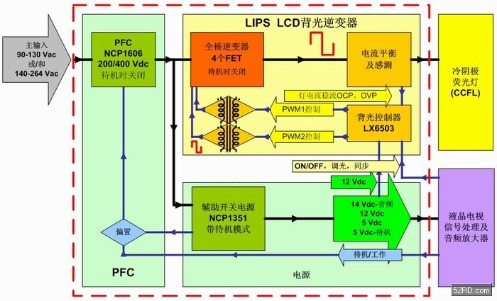 圖2:安森美半導體針對32英寸液晶電視的全橋高壓LIPS解決方案功能框圖。