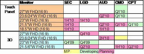 以下簡單摘要顯示器面板在3D與觸控發展趨勢:奇美是所有面板廠中最積極開發具3D顯示與觸控功能顯示器面板的廠商,目前23.6寸寬螢幕3D顯示面板已經量產,接下來23.6寸寬螢幕與27寸寬螢幕具觸控功能面板也將在2010年第一季量產。