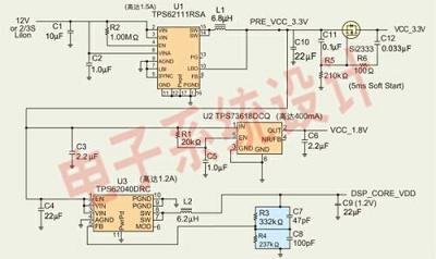 我們構建了若干個電源管理參考設計,并進行數字音頻/視頻應用的測試。這些設計均采用TI的TMS320DM6?43和TMS320DM6?46處理器,這些處理器能滿足排序、電壓精度和啟動要求。圖1是12V電源的參考設計電路圖。該設計采用TPS62111同步降壓轉換器、TPS62040同步降壓轉換器以及TPS73618低壓降調節器,它們分別提供3.3V、1.2V和1.8V電壓軌。這種參考設計包含一個簡單的外部MOSFET、電阻和電容延遲電路,以使3.3V電壓軌能滿足自升壓模式排序方案要求。TPS62040不但提供1.2V的內核電壓,而且還可滿足引腳5軟啟動電容的排序要求。這種解決方案的容差為±3%,效率在90%以上。為滿足主機升壓模式排序方案要求,可以將一個類似的MOSFET、電阻以及電容電路增加到1.2V電壓軌。