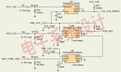 圖2是復位電路。該電路采用TPS3808和TPS3803電源電壓監控器來監控電壓軌的變化情況。請采用最小值的TPS3808G01(U5)來設計復位電路電源。如果需要大于3.3V電壓軌/1.5A電流和1.2V電壓軌/1.2A電流,那么TPS54350和TPS54110SWIFTDC/DC轉換器可能會被分別用于實現3A和1.5A電流。SWIFT穩壓器具有基于DaVinci技術的數字視頻EVM的特點。如欲了解更多采用了線性調節器、TPS40KDC/DC轉換器、TPS62xxxDC/DC轉換器或多輸出電源管理單元(PMU)的5V和12V輸入電源