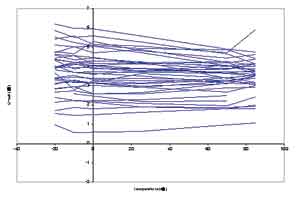 帶隙基準源中的電流級存在一定的生產差異(productionvariation),使得25℃時的基準額定值、曲率形狀和曲線最平坦部分的位置都會發生各種變化,因此需要進行工廠校準,以盡量減小這種變化的影響,圖3所示為一個未校準基準源帶來的變化實例。在-20~+85℃的溫度范圍內,最高差異為-0.9~0.20%。而圖3則顯示有兩個離群點的曲線跟大多數其他器件的曲線有相當大的差異。