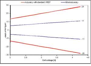 BM器件中常用的標準帶隙基準源針對額定變化被校準,在25℃時的精度極高。然而,曲率形狀和位置變化的補償也相當常見,這就產生與溫度變化有關的大幅變化,使得在高和低溫時電池電壓測量不夠精確。此外,也不可能檢測和顯示出曲線形狀顯著不同的離群點。