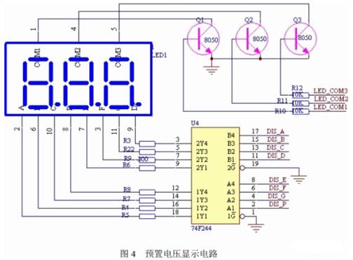 預置電壓顯示電路如圖4 所示。本設計選用譯碼驅動器74F244,用來驅動LED 數碼管 顯示預置電壓,分別由單片機P2.0~P2.7 接口控制。LED 共陰極控制端由P1.4~P1.6 接口 控制,并用三極管8050 來控制LED 的顯示。